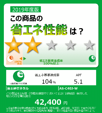 商品仕様 省エネ達成率 104% 通年エネルギー消費効率(APF) 5.1 電源 室内電源 単相100V/20A 配管径 液側φ6.4 ガス側φ9.5 (2分3分) 最大配管長 20m(チャージレス15m) 最大高低差 15m 能力値データ 畳数の目安 暖房時 11〜14畳(18〜23m2) 冷房時 11〜17畳(18〜28m2) 能力 暖房時 5.0(0.9〜6.3)kW 冷房時 4.0(0.9〜4.3)kW 消費電力 暖房時 1,350(140〜2,000)W 冷房時 1,210(150〜1,500)W 寸法データ 室内機 高さ250 × 幅728 × 奥行285(+2)mm AS-C40J-W 室外機 高さ542 × 幅799(+68) × 奥行290(+63)mm AO-C40J (※設置するにあたり、上記寸法以上のスペースが必要となります。
