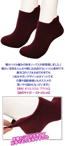 無地6色【思いやり設計】片手で履きやすい楽々パイルソックス♪履き口が片手でもつまみやすいデザインで履きやすい♪【レディース 婦人 レッグウエア 靴下 防寒保温 介護】[春物][冬物][秋物]