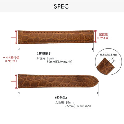 商品スペック カラー ホワイト White(017) ブラック Black(019) ゴールドブラウン Gold Brown(041) ダークブルー Dark Blue(061) バーガンディ Burgundy(082) ピンク Pink(287) シャイニーブラック Shiny Black(919) シャイニーブラウン Shiny Brown(932) シャイニーブルー Shiny Blue(965) 素材 アリゲーター(ワニ革) 長さ 【女性用サイズ】 剣先側90mm / 尾錠側85mm 【女性用サイズ ※Eサイズ12mmのみ】 剣先側85mm / 尾錠側80mm 厚さ 【女性用サイズ】 約3.5mm サイズ展開 【女性用サイズ】 E12mm-B12mm E14mm-B12mm E15mm-B14mm E16mm-B14mm E17mm-B16mm ※【E】は時計に装着する側の幅、【B】はバックルの幅です。